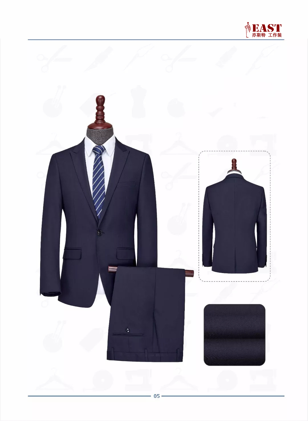 全體感覺也比較呆板厚重,毛襯是用縫合線手工纖合在面料背面的,與面料之間有空地,能夠更好的體現(xiàn)高支紗面料的瀟灑感,使整件西裝看起來靈動自然、層次分明、賦有韻律。
